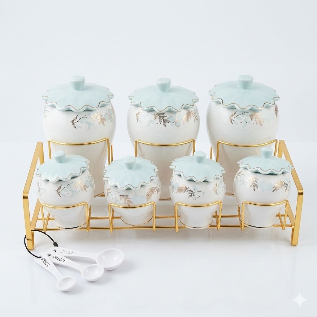أضيفي لمسة من الفخامة والرقي إلى مطبخك مع طقم التوابل السيراميك الفاخر. بتصميمه المستوحى من الأناقة الكلاسيكية، يجمع الطقم بين اللون الأبيض النقي والغطاء السماوي الهادئ مع نقوش ذهبية رقيقة تمنح مطبخك مظهراً ملكياً لا يُقاوم.