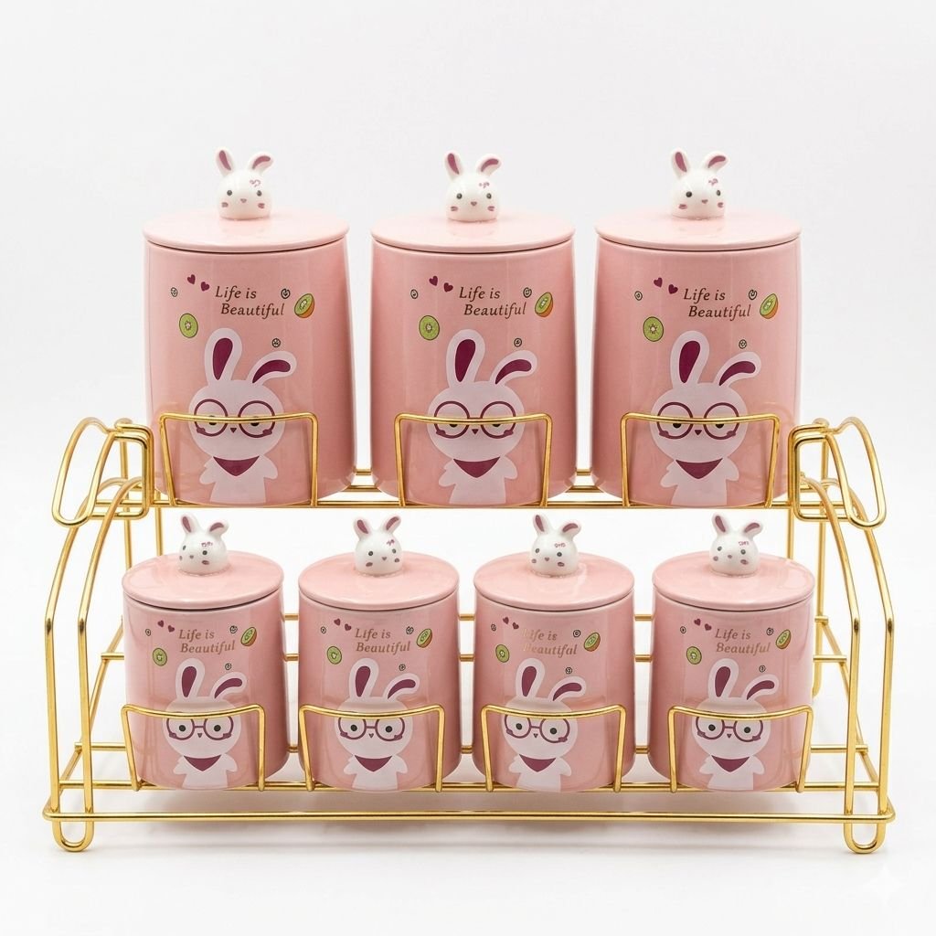 طقم توابل سيراميك “الأرنب الكيوت” – 7 قطع مع ستاند ذهبي